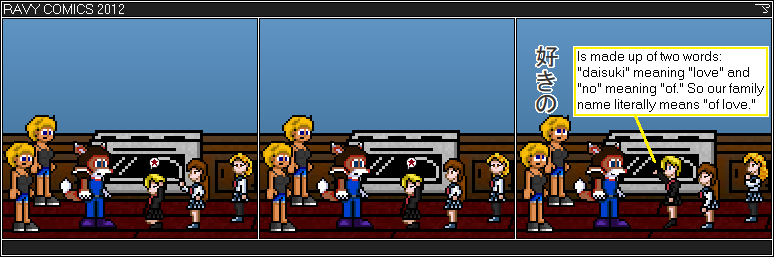 In 2012 I did a comic where Toki explains the name Daisukino. I used Kanji for the "Daisuki" part and the Hiragana version for "no." That is typically used to mean "of." So the family name literally means "of love."