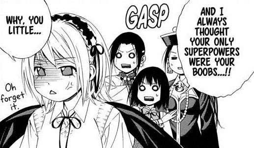The real insight comes to Yukari. Normally on mind swaps the person gets a major insight to the person they have taken over. She sees herself from the outside and has the shock of her life. Her view of herself is completely destroyed when she finally realizes that she is a little girl with lots of growing yet to do. Of course, we can always count on Tsukune to tell her what her friends really think of her. So we can have that reset to zero by the next chapter.