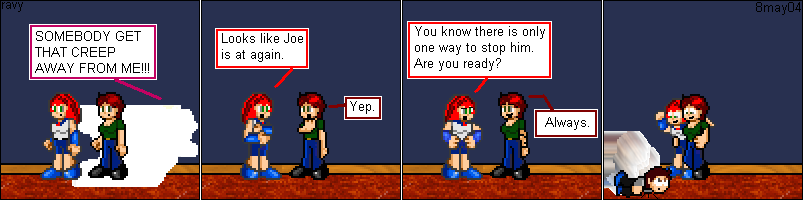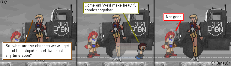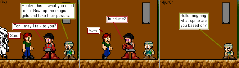 I did a lengthy 500th comic special of which I was only able to salvage about five comics for the main line. The reason for the drastic cuts was because I could not get anybody's permission to use their characters. These two were so funny, I had to show them off. I just whited out the character that could get me in trouble.