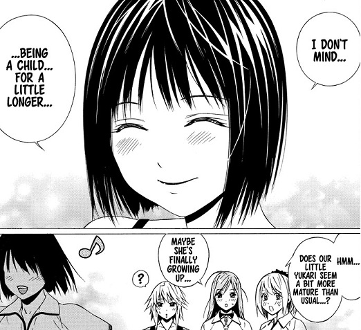 The real insight comes to Yukari. Normally on mind swaps the person gets a major insight to the person they have taken over. She sees herself from the outside and has the shock of her life. Her view of herself is completely destroyed when she finally realizes that she is a little girl with lots of growing yet to do. Of course, we can always count on Tsukune to tell her what her friends really think of her. So we can have that reset to zero by the next chapter.